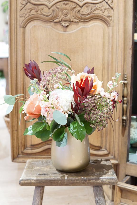 - Textural interest: Layered seasonal stems and delicate filler blooms add depth without feeling busy.