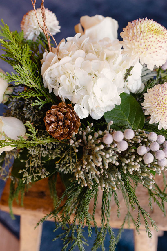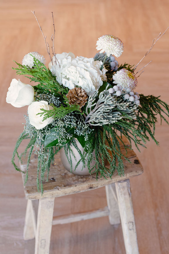 This December arrangement captures the quiet luxury of winter with a serene mix of crisp whites, frosted textures, and evergreen tones. Set in a matte gold vessel, it balances soft elegance with natural depth—like a peaceful forest walk after the first snowfall.