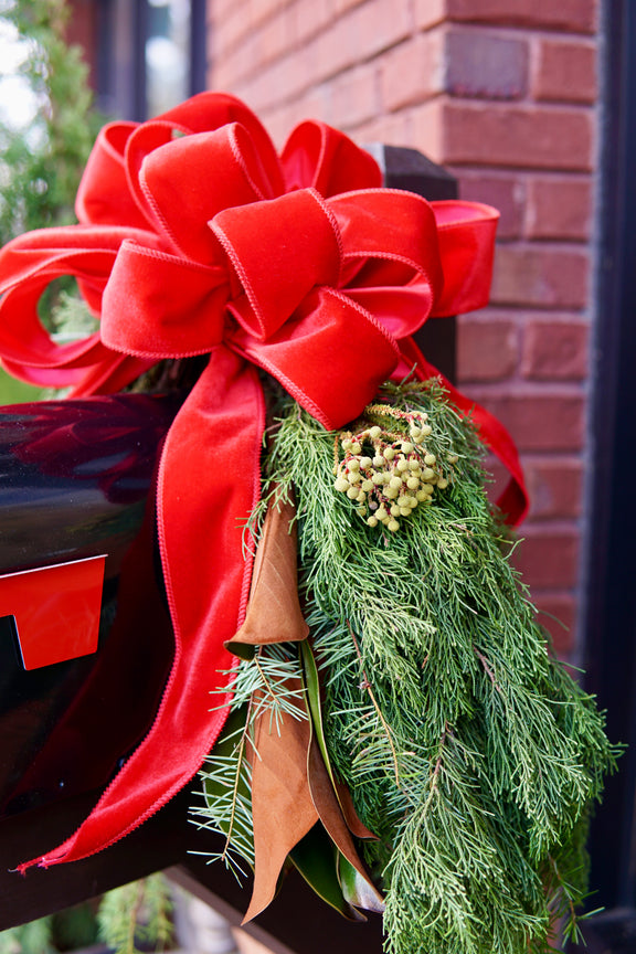 This Mailbox Wreath brings holiday charm right to your doorstep, featuring cascading fresh evergreen branches, rich magnolia leaves, and a burst of texture from winter berries. A bold velvet red bow ties it all together—classic, joyful, and unmistakably Christmas.