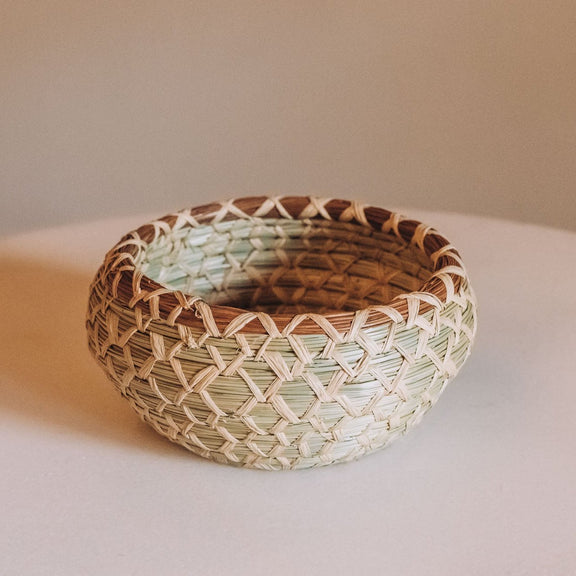 Indulge in the elegance and functionality of the Yesica Basket. Handwoven from native grass in Guatemala, this organizer brings a touch of artistry into your home. Keep your space tidy while supporting traditional craftsmanship and creating a statement piece. 5" wide x 2.4" high